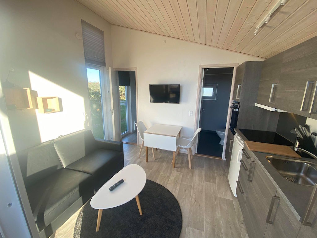 Vi bodde 2 voksne og 2 barn i en av plassens nyere luksushytter med eget bad og toalett en helg i oktober.