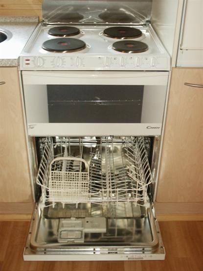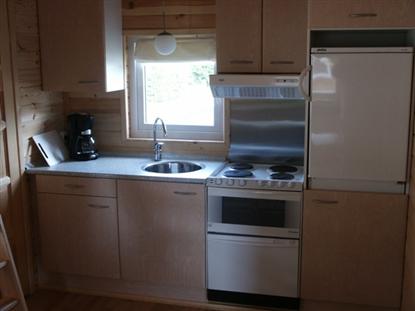 Kjøkkenet er innredet med kjøleskap i ståhøyde, ventilator, komfyr med kokeplate, ovn og oppvaskmaskin (noe som også er helt nytt i luksushytta). Det er imidlertid ikke mye avlastningsplass. Det er servise til 6 personer, med alt man trenger.