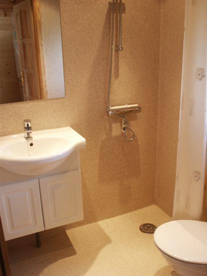 Badet er lite, men godt utnyttet med toalett, møbel og dusjhjørne med dusjforheng samt innfelte spotter som gir veldig godt lys. Det er også et åpningsbart vindu på badet, så man kan lufte godt ut etter dusjen.