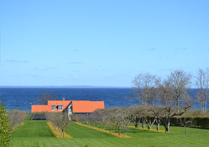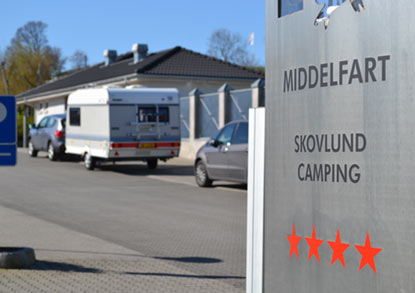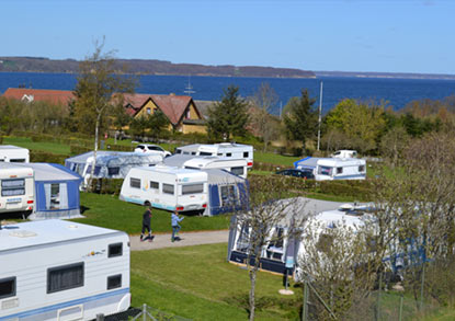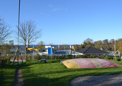 Kjørende tett på vannet, plutselig dukker Baaringvig Feriepark - Skovlund Camping opp ca. 10 km fra Middelfart og HELT fantastisk plassert på en skråning hvor det er havutsikt fra første til siste rekke.