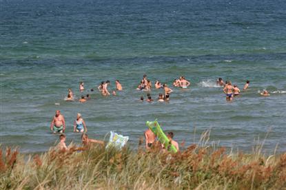 Å bygge et sandslott ute midt i vannet er en av mulighetene det grunne vannet inviterer til, og den grunne sandbunnen strekker seg mange hundre meter ut i vannet.
