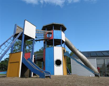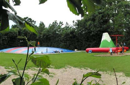 Ved plassens innkjørsel ligger informasjon, minimarked, kafeteria og den store lekeplassen - som vi nok nærmere vil betegne som et direkte lekeland. Der er alt hva et barnehjerte kan begjære.