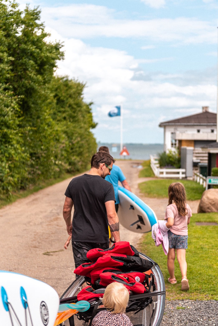 Det er direkte tilgang til den barnevennlige stranden via en liten vei som går gjennom det tilstøtende sommerhusområdet. Kun litt over 100 meter må man gå før tærne er solidt plantet i strandsanden.