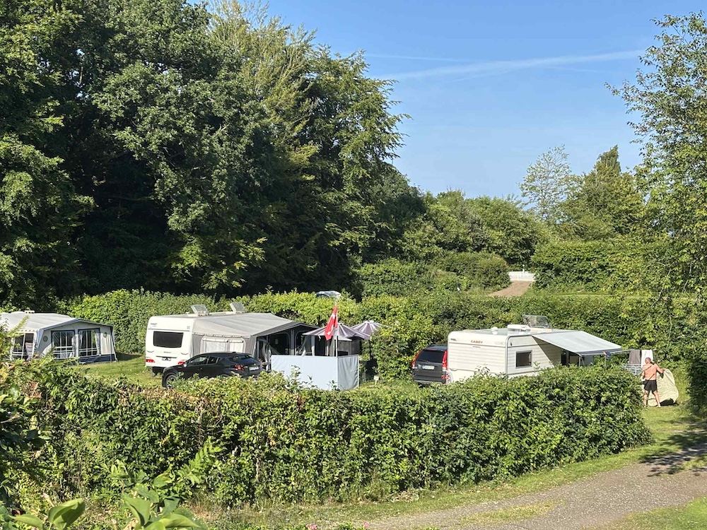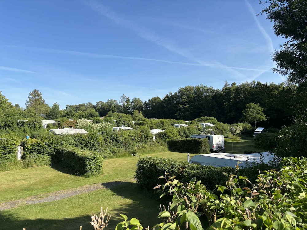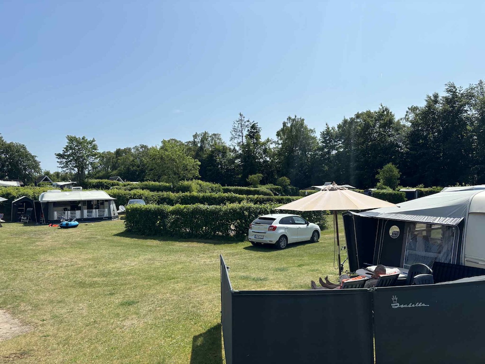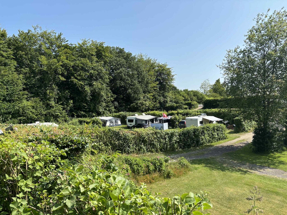 En campingplass med mange muligheter Plassen er omgitt av høye trær og er naturlig delt inn i forskjellige soner. Vi bodde i den vestligste delen - et område kalt Paradiset, som ligger hevet på et platå med utsikt over plassens varierende nivåer.
