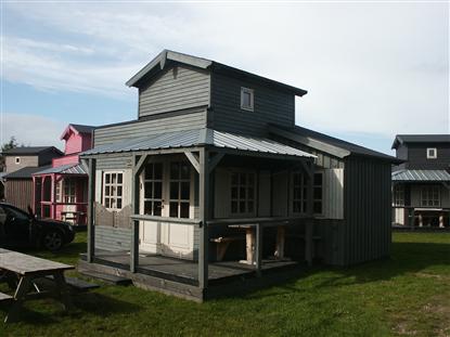 Hytta er malt i grå og brune nyanser og utformet som en ekte saloon, med saloondører og hele molevitten.
