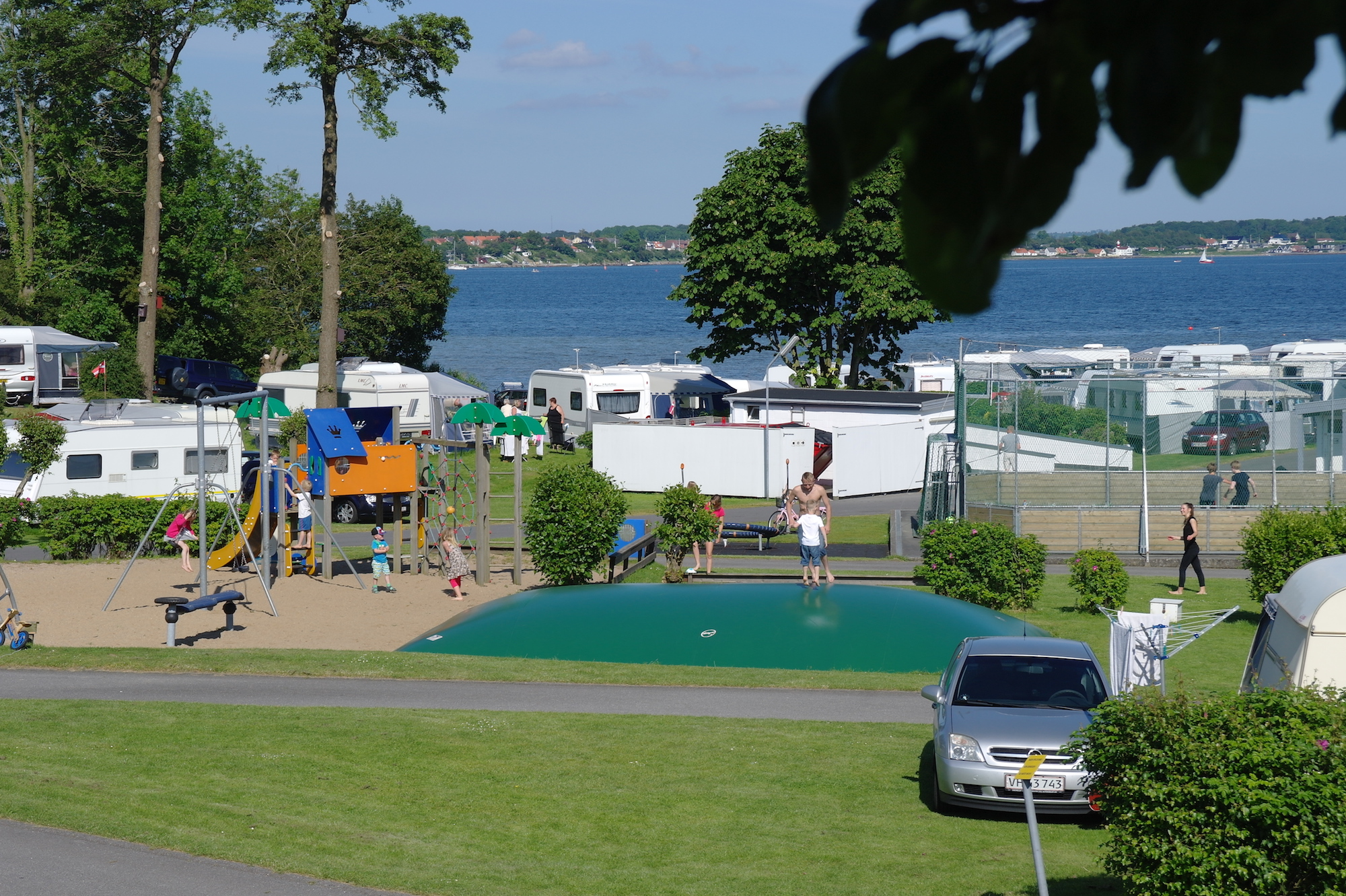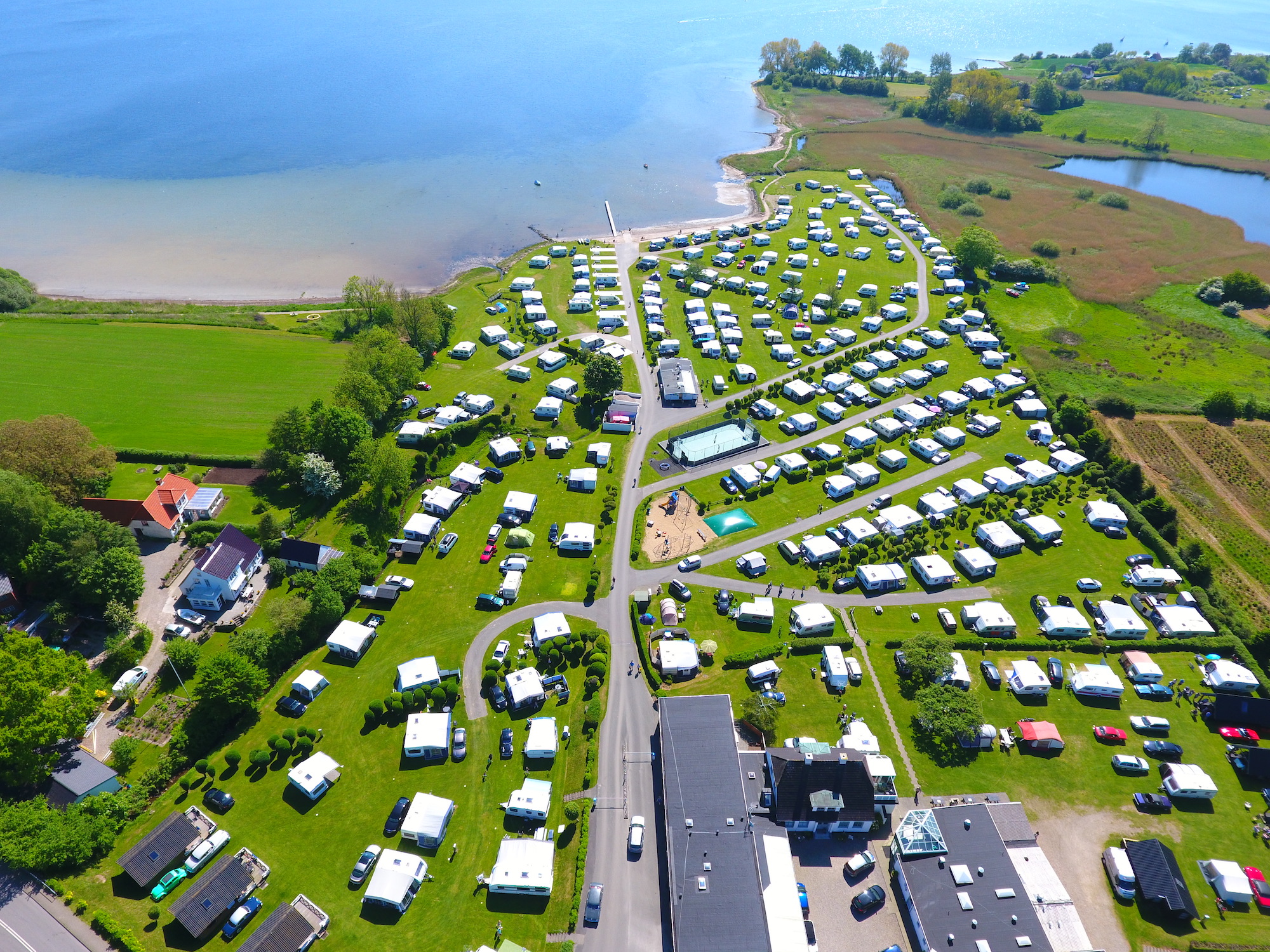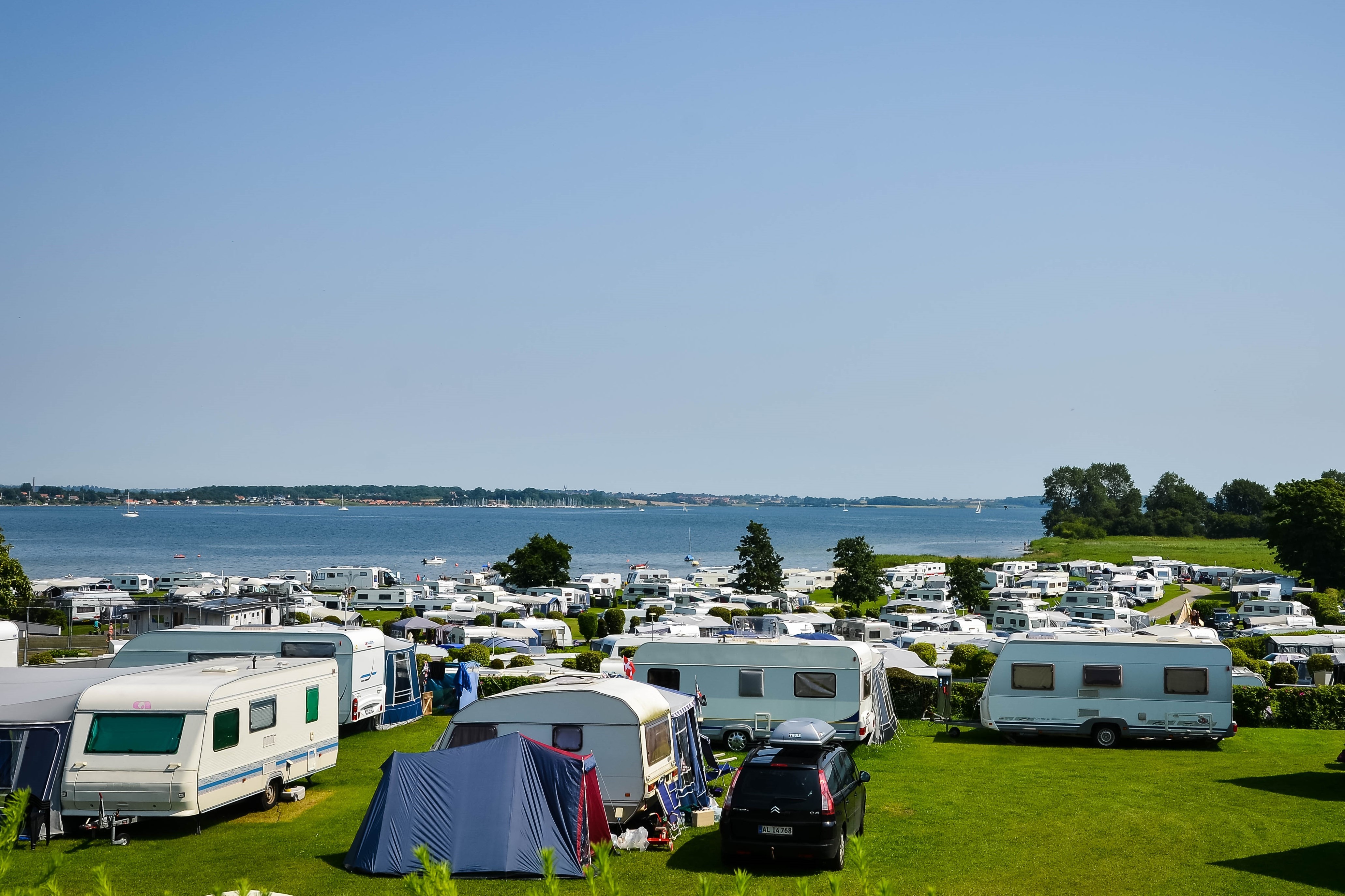 Sett campingvognen bare noen få meter fra vannkanten. Det er mulig på Lærkelunden Camping ved Gråsten - en plass med lys, luft, vann og flotte fasiliteter.