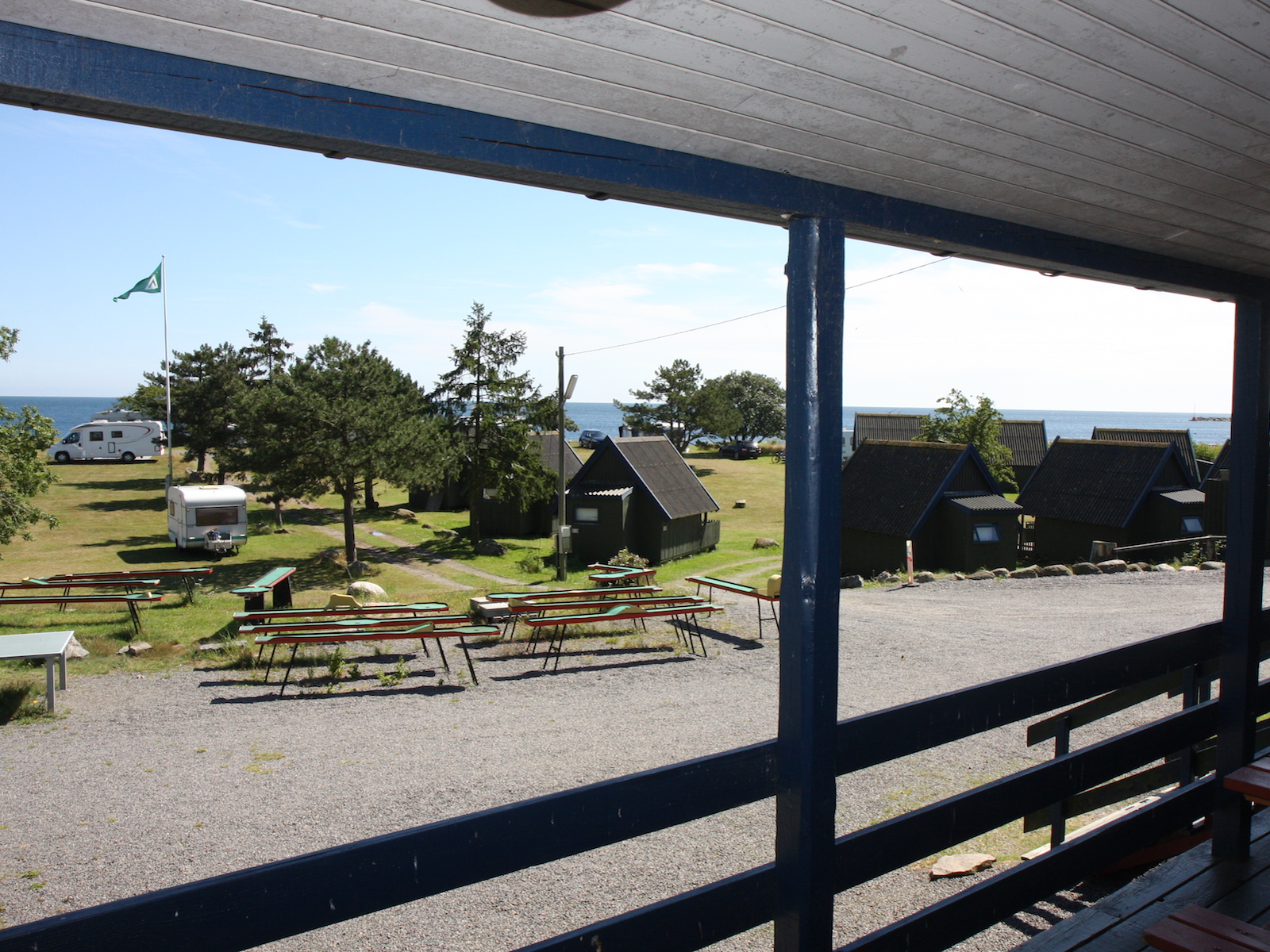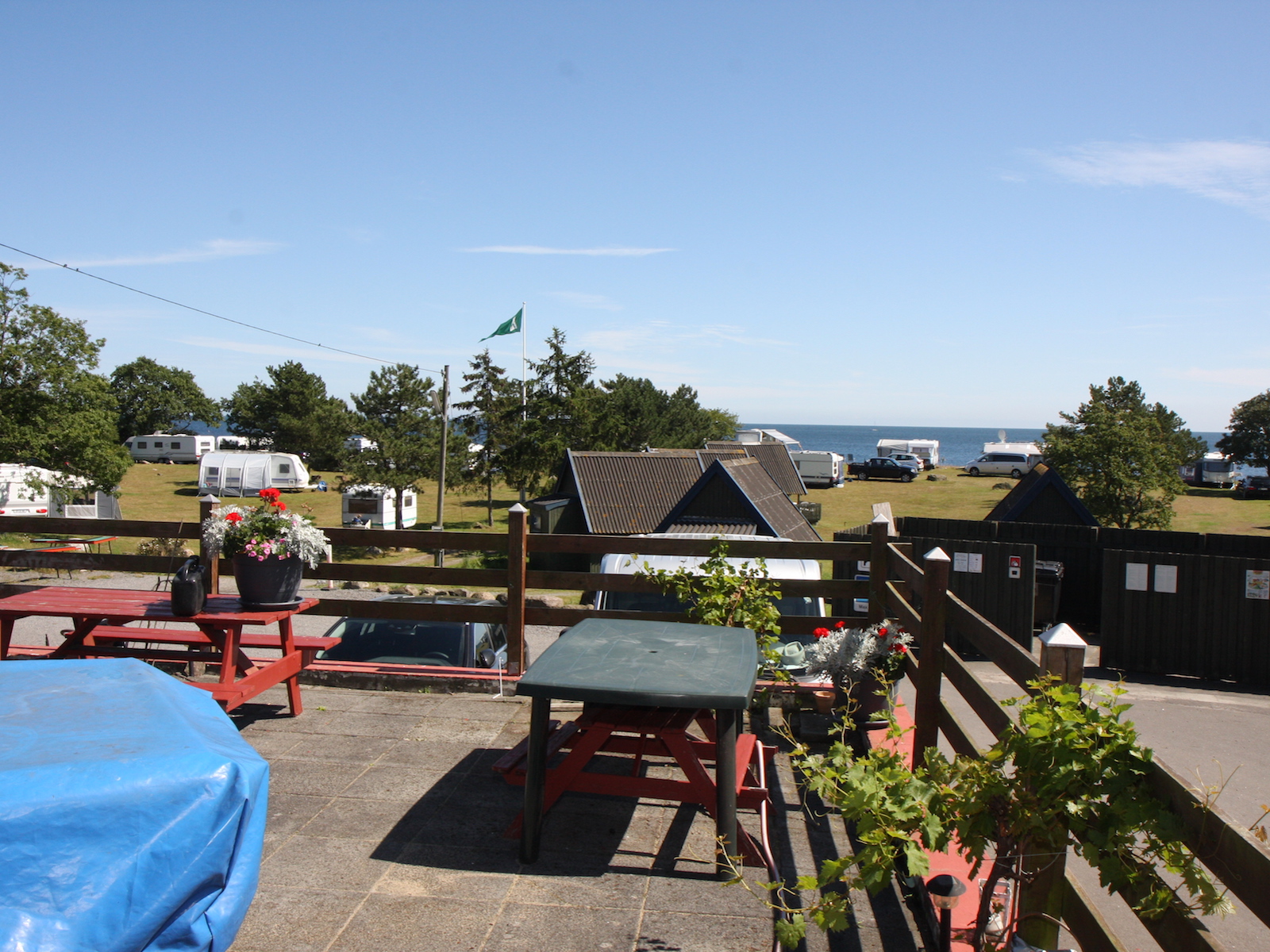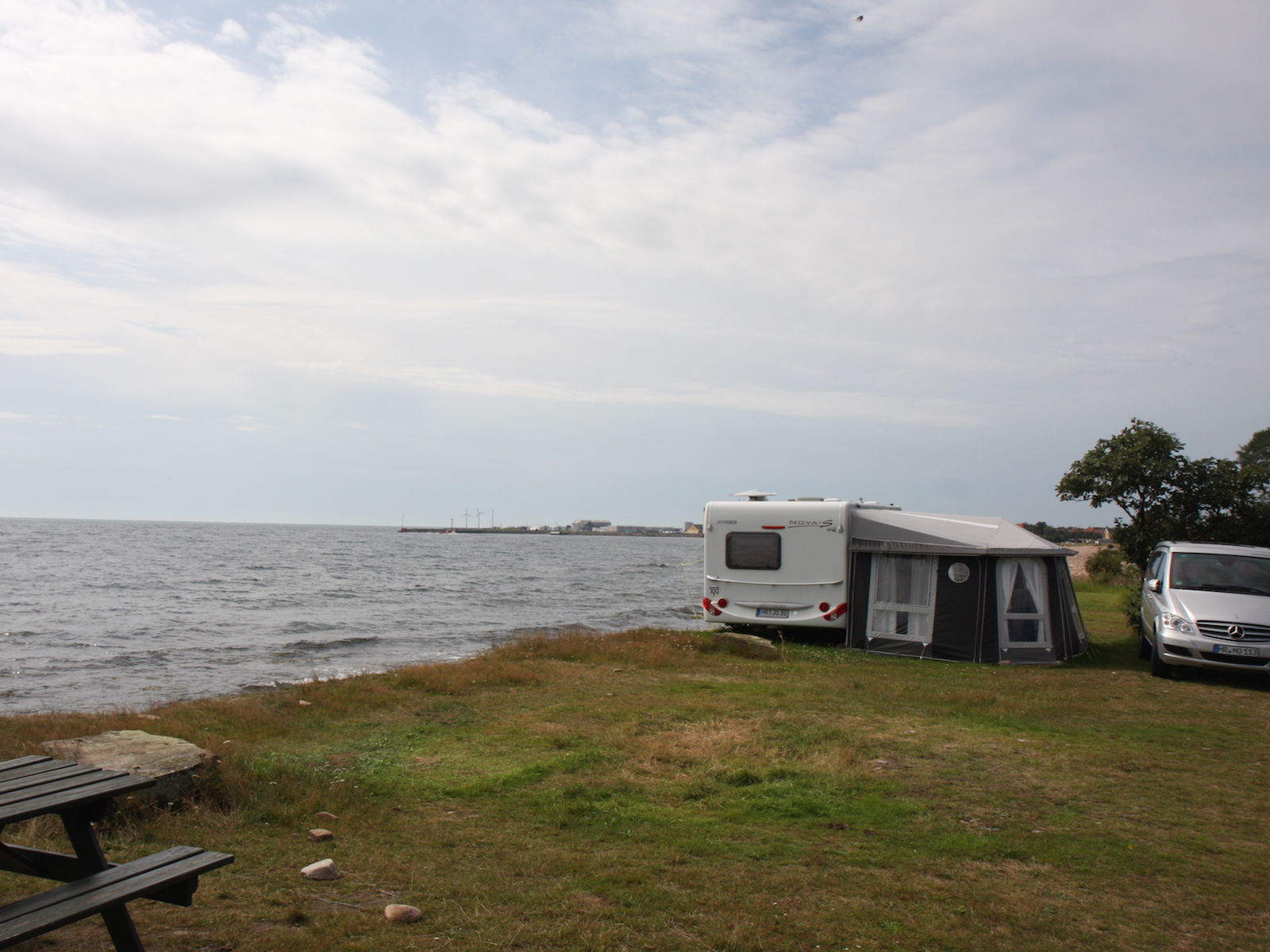 Det er ingen tillegg for havutsikt. Her gjelder først til mølla. Plassene kan være booket, men vi fikk en fin plass med utsikt til Nexø Havn og masse vann. Vi kunne ha fått en plass helt ned til vannet, hvor det noen ganger spruter opp på plassen.