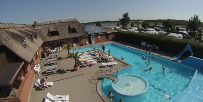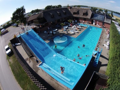 Havvannet er imidlertid ikke de eneste mulighetene for lek for vannhundene. For på campingplassen er det nemlig et riktig fint bassengområde/badeland - spesielt hvis man tar plassens litt beskjedne størrelse i betraktning. Det er et badeland med flere bassenger og flere sklier.