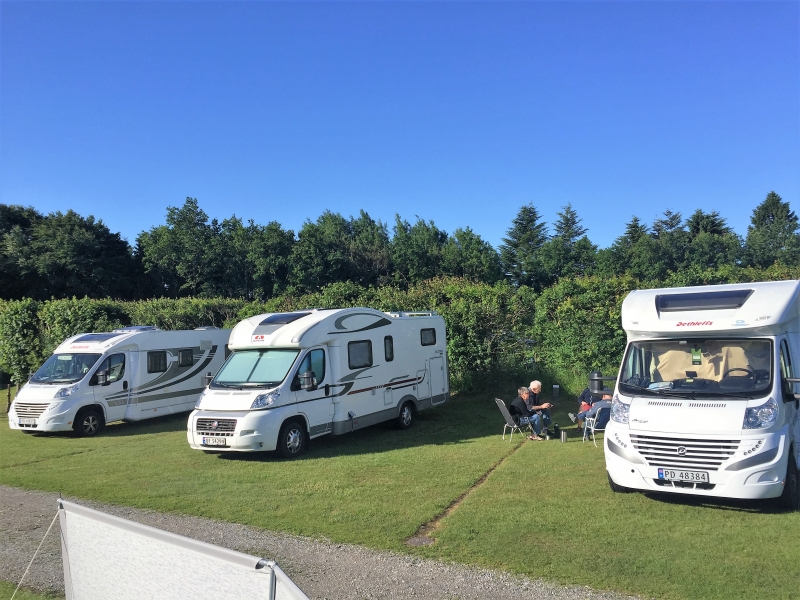 Strømplasser med 13 og 16 Amp og med måler, som avregnes til kr. 4 pr. kWh. Dusj er gratis.