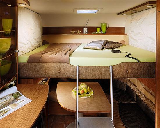 Designerene hos Bürstner har virkelig latt fantasien få fritt spillerom, og det har resultert i noen nyskapende og spennende løsninger. Inne i vognen har de skapt plass til flere soveplasser ved å innføre et nytt konsept – "heve-/senkesengen" eller heisesengen, som Bürstner selv kaller den. I praksis skjules sengen under taket og er pent kamuflert som en stjernehimmel på dagtid. Om kvelden trekkes sengen ned og er klar til bruk på et halvt minutt.