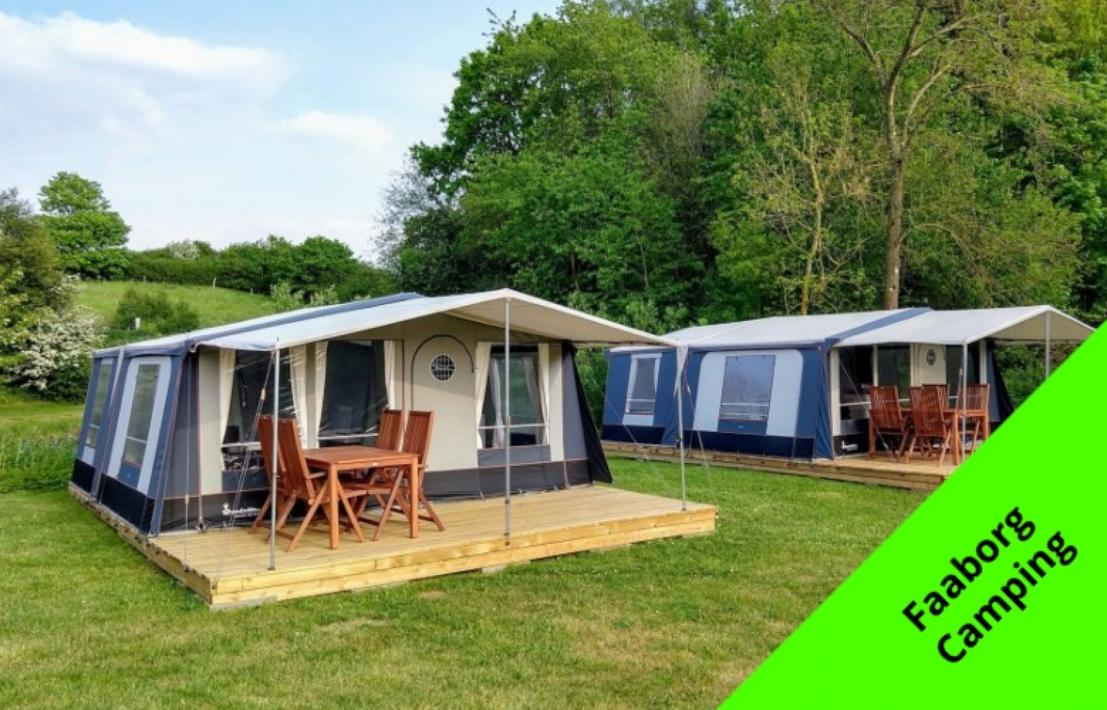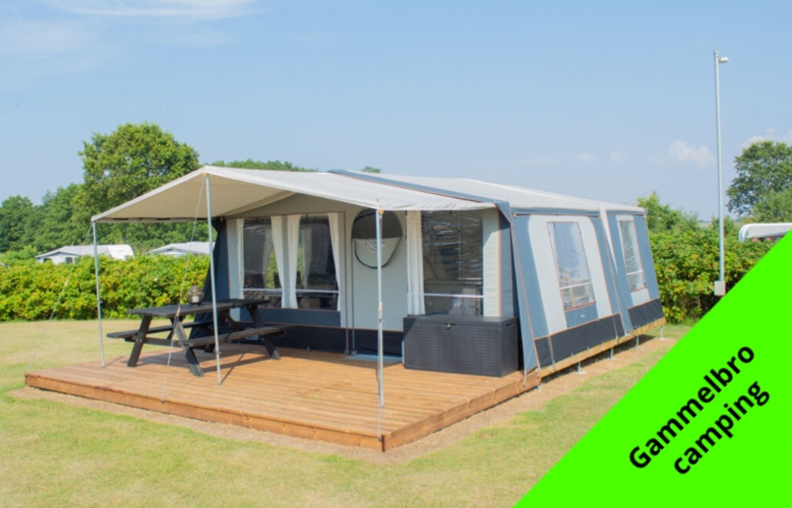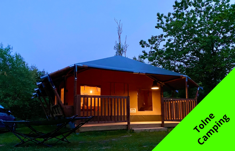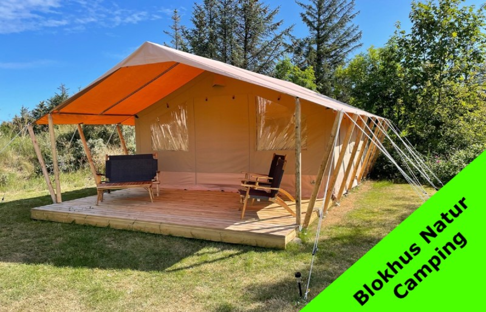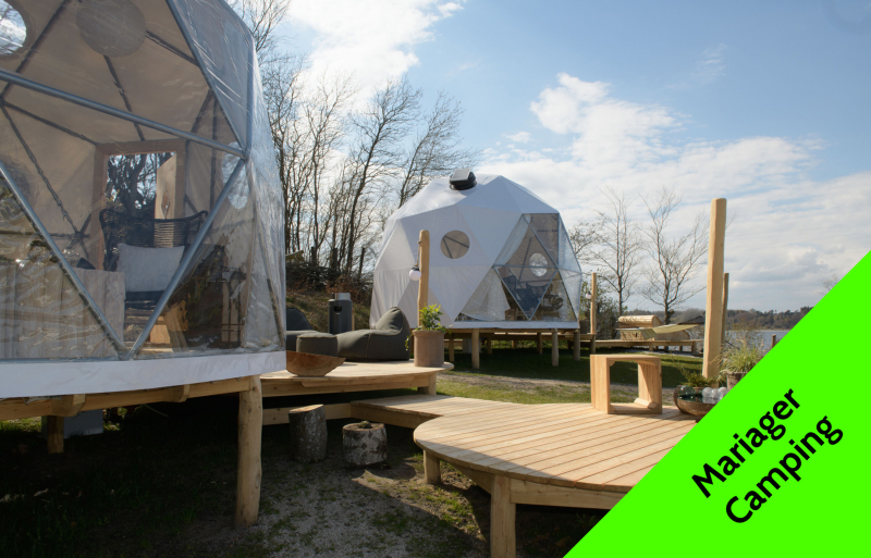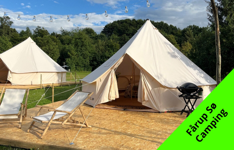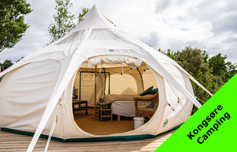 Glamping i Danmark kjennetegnes ved at det skjer i lekre hytter eller større telt hvor det, i motsetning til et vanlig telt, finnes ordentlige senger, kjøleskap og for eksempel TV. Men man bor fortsatt utrolig nær naturen og med tilgang til det fellesskapet som kan finnes på en campingplass, dersom man ønsker det. Det kan til og med være innlagt vann og varme i teltet, slik at du har mulighet til å dusje i din helt egen dusj i teltet. Dette er for eksempel mulig i Safaritelt på Trelde Næs Camping.