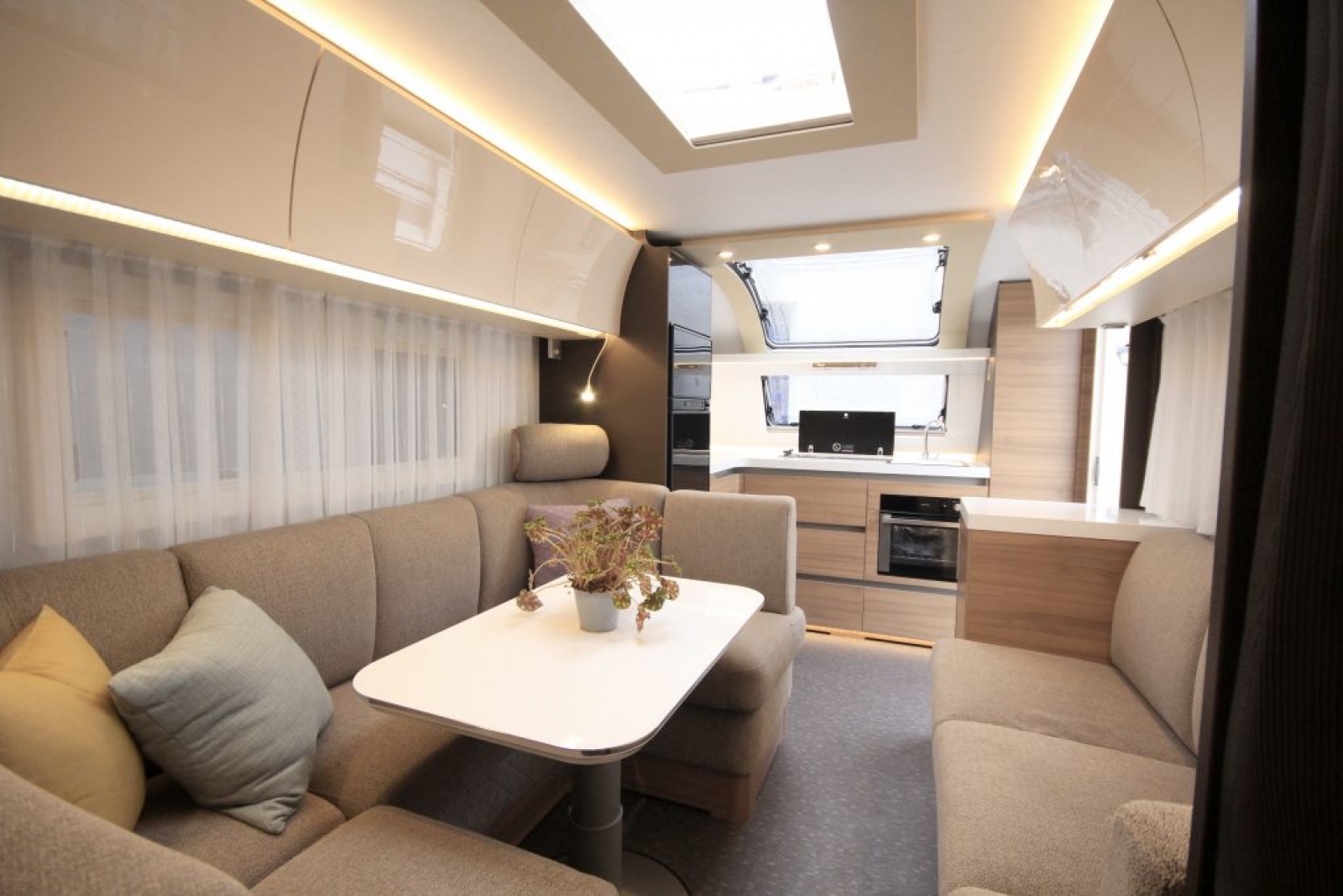 Hjørnekjøkkenet og loungen i den fremre delen av vognen er lånt fra den populære 663 HT. Med andre ord blir man bortskjemt med et topputstyrt kjøkken, inkludert gass-stekeovn, og arbeidsplassen er nærmest overdådig. I tillegg har man den beste utsikten gjennom sky-light-vinduet når man tryller på kjøkkenet.