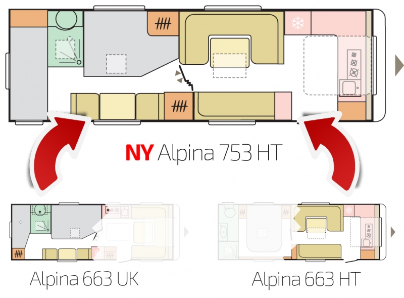 De to populære innredningene danner grunnlaget for en ny planløsning i 2019 – den nye, store Alpina 753 HK. Her har man rett og slett tatt det beste fra begge modellene, og resultatet er en helt ny innredning.
