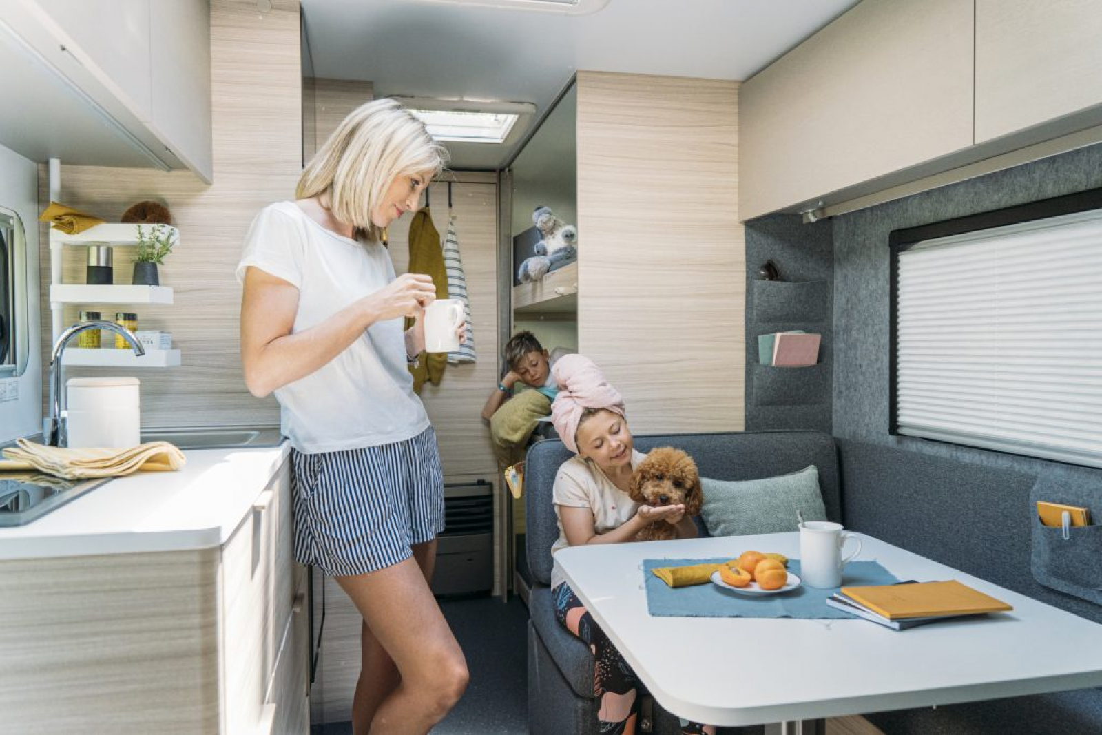 Og så har veggene ved sittegruppen fått eksklusivt filt-look samt myggnetting- og mørkleggingskassett, hvor du bestemmer om avskjermingen skal være delvis nede eller oppe.