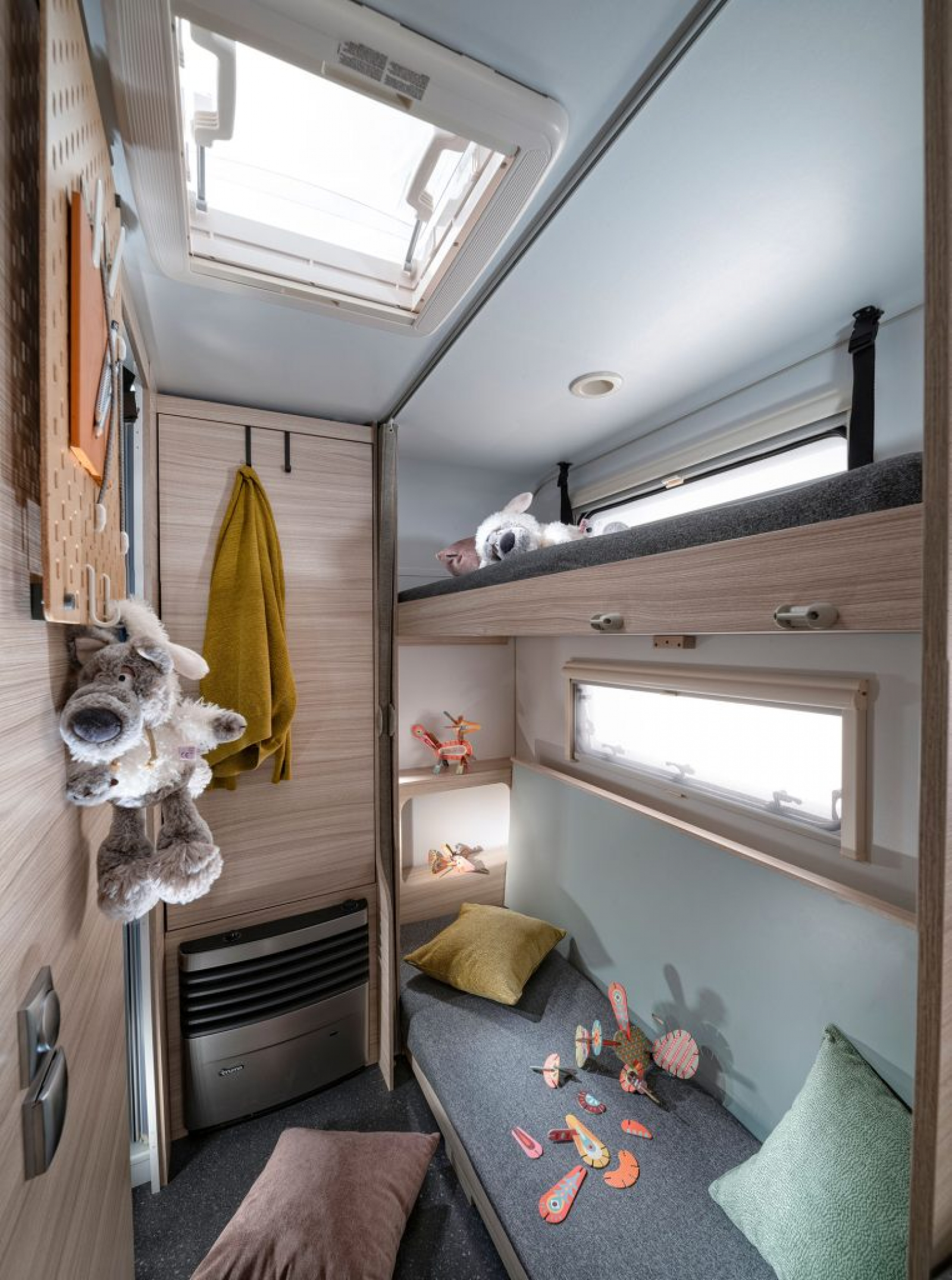 Side-dinettgruppene er gjort om til “ekte” rundsittegrupper… Utvalgte overskap har fått ekstra hylle… Det har også kommet stofflommer til oppbevaring flere steder i vognen – de er både dekorative og gir ekstra hygge…